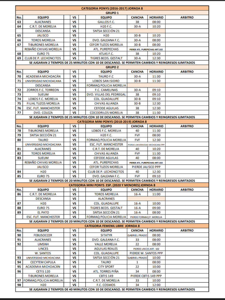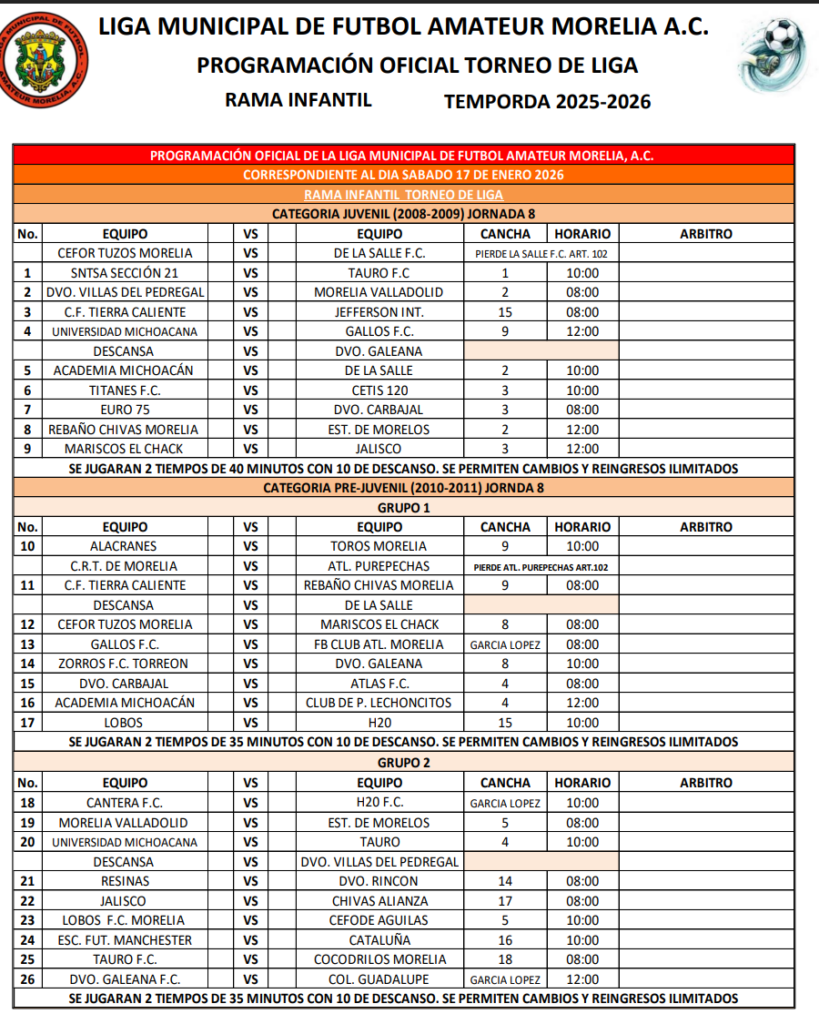 La Liga Municipal de Morelia anunció los partidos para las categorías infantiles y femenil por la jornada 8 del torneo, consulta el horario de tu equipo favorito a continuación.