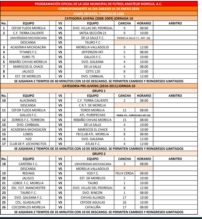 Te dejamos la programación de la fecha 10 para los partidos de las ramas infantiles y femenil de la Liga Municipal de Morelia
