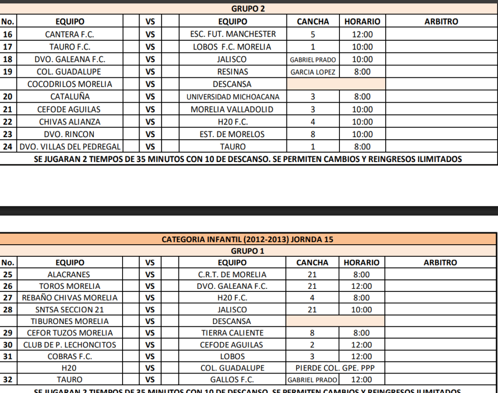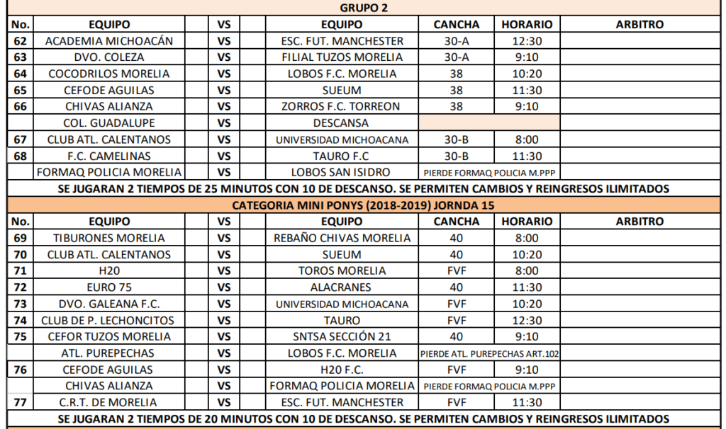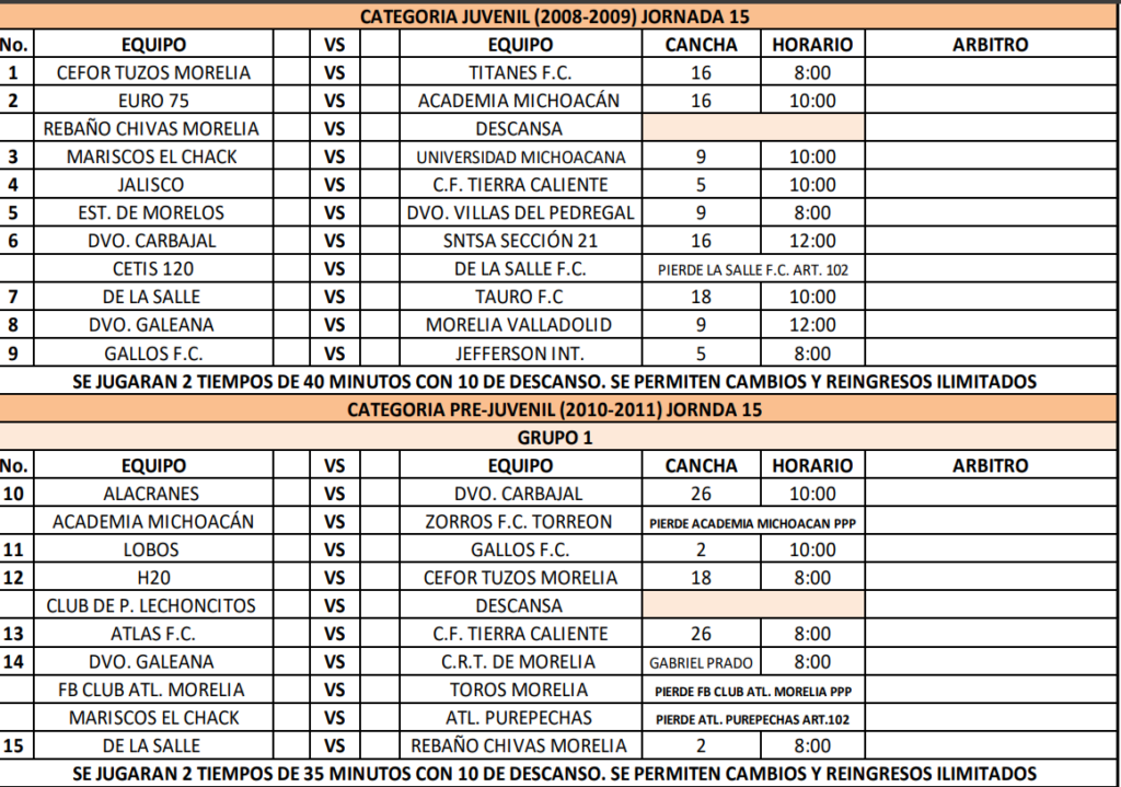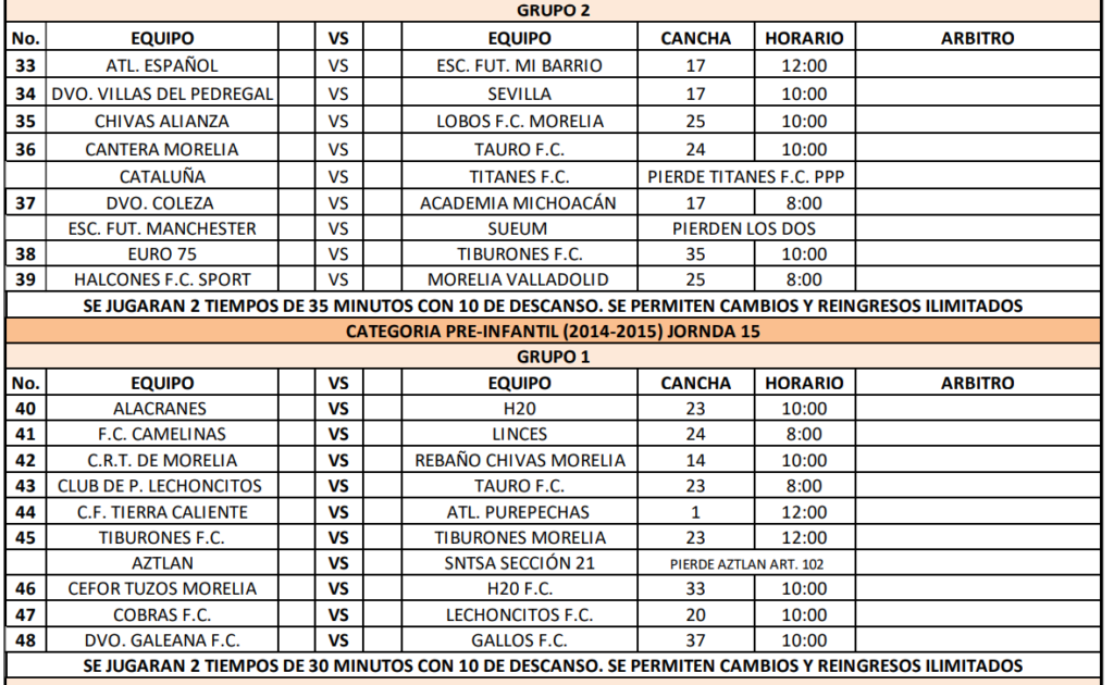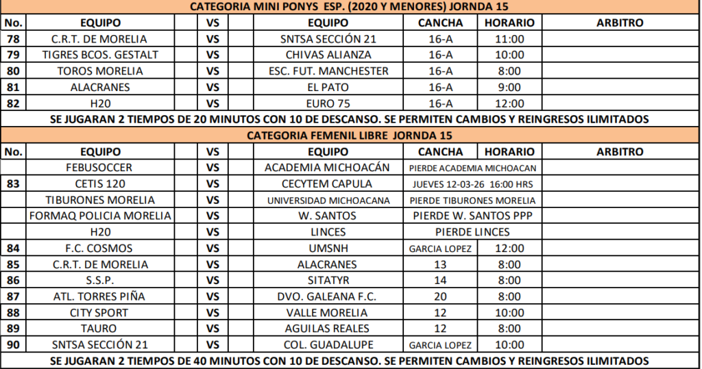 Compartimos los partidos de la semana 15 para las ramas infantiles y femenil de la Liga Municipal de Morelia, consulta cuando juega tu equipo y no te pierdas de la acción.